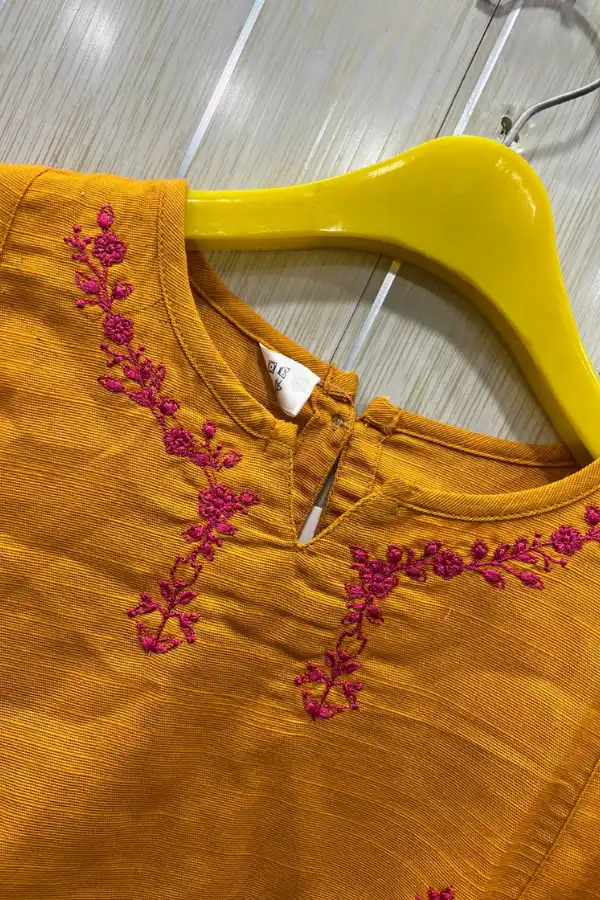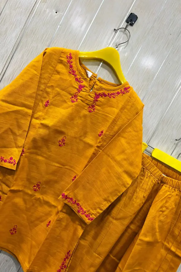 This 2-piece stitched suit includes a finely embroidered kurta and matching Slub Khadda trousers. The Teal Blue version features delicate white threadwork embroidery that adds a calm, elegant look, while the Mustard Yellow edition pops with vibrant magenta floral embroidery for a festive touch. Each piece is expertly tailored, offering a neat, ready-to-wear finish that saves you the hassle of stitching or alterations.