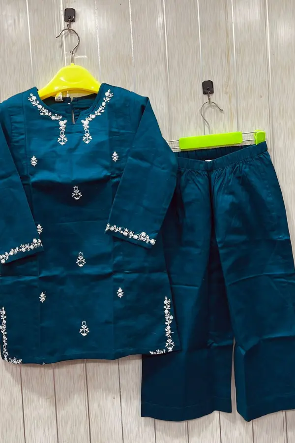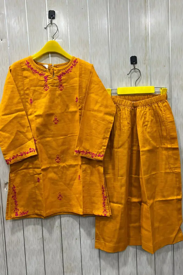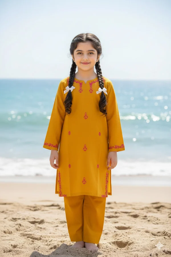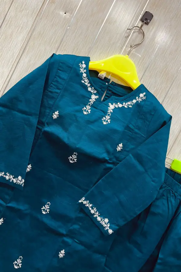The Rosa Lifestyle Hub Embroidered 2-Piece Stitched Slub Khaddar Kurta Suit for Girls (Teal & Mustard Edition) combines traditional grace with modern comfort. Designed for kids girls (5–15 years), each outfit is made from premium breathable Slub Khadda, ensuring softness and durability for all-day wear in Pakistan’s warm climate.