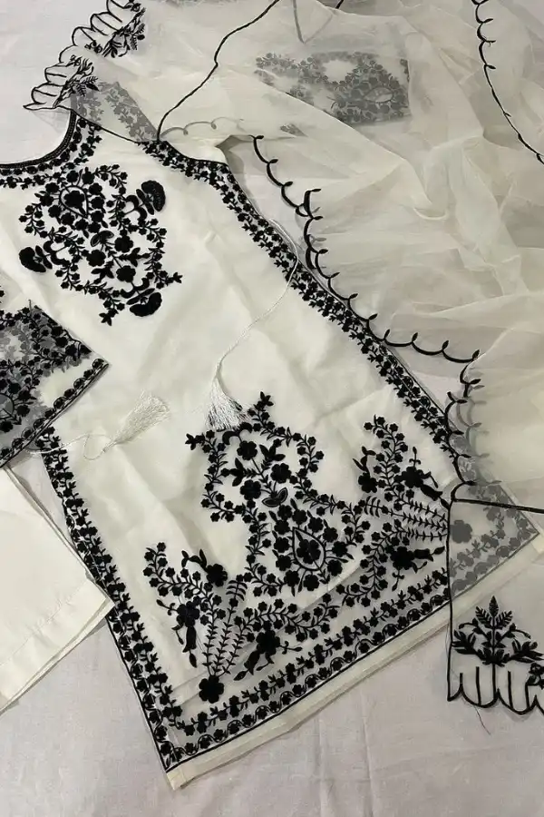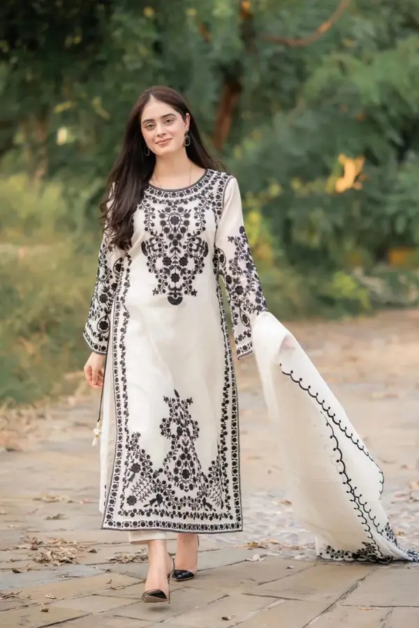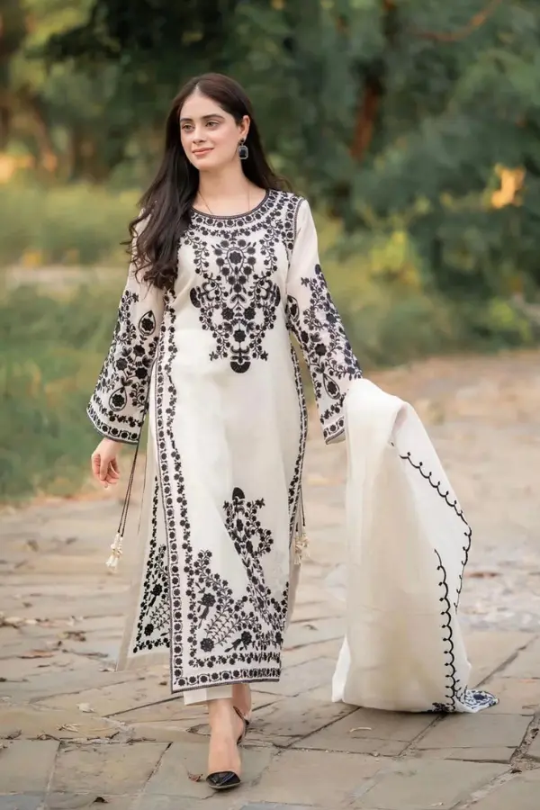 The Rosa Lifestyle Hub‘s White Snow Organza 3PCS is a refined party wear outfit designed for women who appreciate elegance, subtle luxury, and timeless style. Crafted in a soft white tone with delicate embroidery, this three-piece ensemble offers a graceful look that works beautifully for weddings, festive gatherings, and formal evening events.